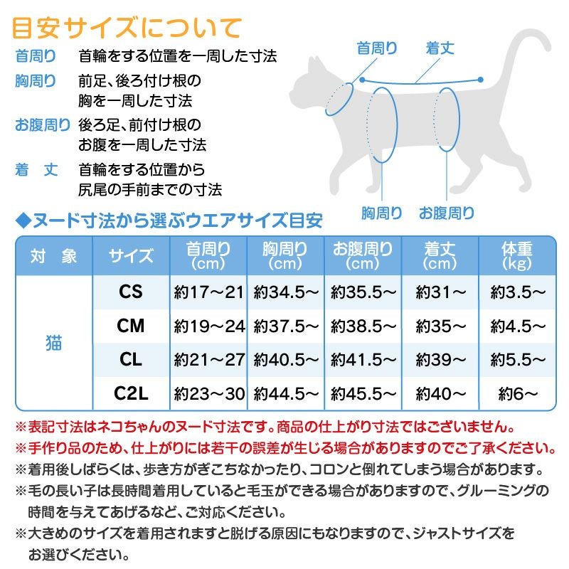 ☆3/10 CS届きましたので追記です。  猫2(雑種)、猫3(洋猫ミックス)共にCSで胸周りピッタリ、首元少し余裕で着用出来ました。ありがとうございました。皆様のサイズ選びの基準になれば幸いです。リピ予定です。 ───── ☆初回購入時レビュー 首周りをよく引っ掻く子のために買いました。お揃いで兄弟猫と同居猫にも買ったので三匹分着用レビュー書かせていただきます。計測数値はあくまでも目安です。 ・猫1♂兄雑種/首周り20/胸周り35/着丈36/体重5前後  →CSで肩周り胸周りがフィット。ゆったり着れています。 ・猫2♂弟雑種/首周り17〜18/胸周り32/着丈33/体重4.5程度  →首周り、胸周り共にかなり緩め。普段着用している皮膚保護ウェアや猫用袖なしつなぎはCMでちょうどいいのですが、トップスのみのネックウェアだと上半身の華奢さの方がサイズにダイレクトに響くようです。素材的には引っ掻きに強いので助かっています。 ・猫3♀洋猫MIX/首周り19/胸周り33/着丈36/体重5前後  →兄猫より半周り大きい洋猫ミックス♀(こちらも普段CM着用)にCMを着せてみると、やはり上半身が華奢なのか首周り胸周りがかなり緩めでした。 上記の兄弟二匹は同腹同時生まれ色違いですが、サイズを測った上で同じCMを着せると骨格の差が大きく影響しました。
