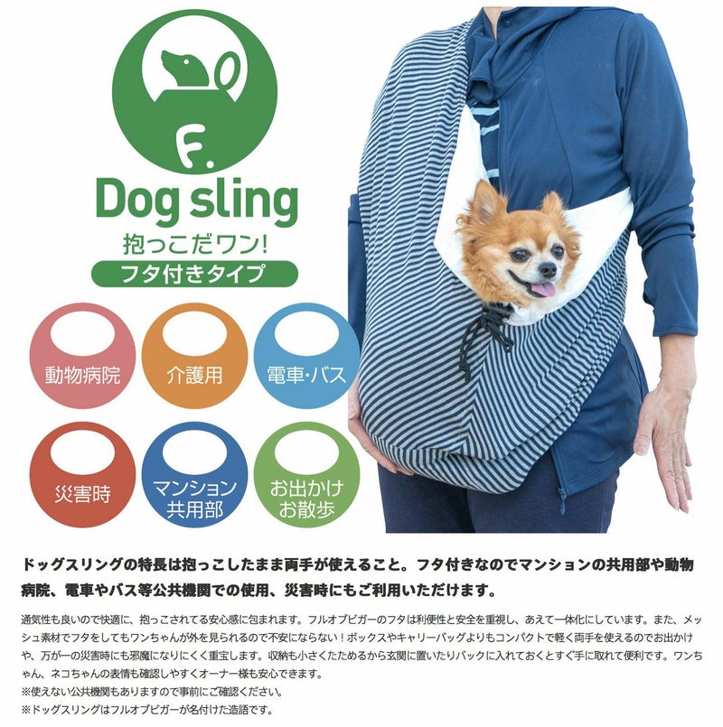 お出かけ範囲が大きく広がるフタ付きのドッグスリングです。