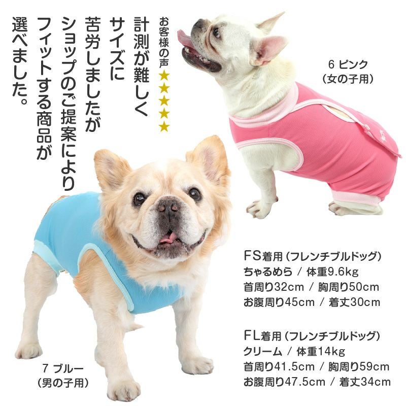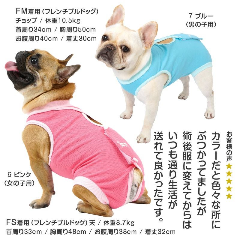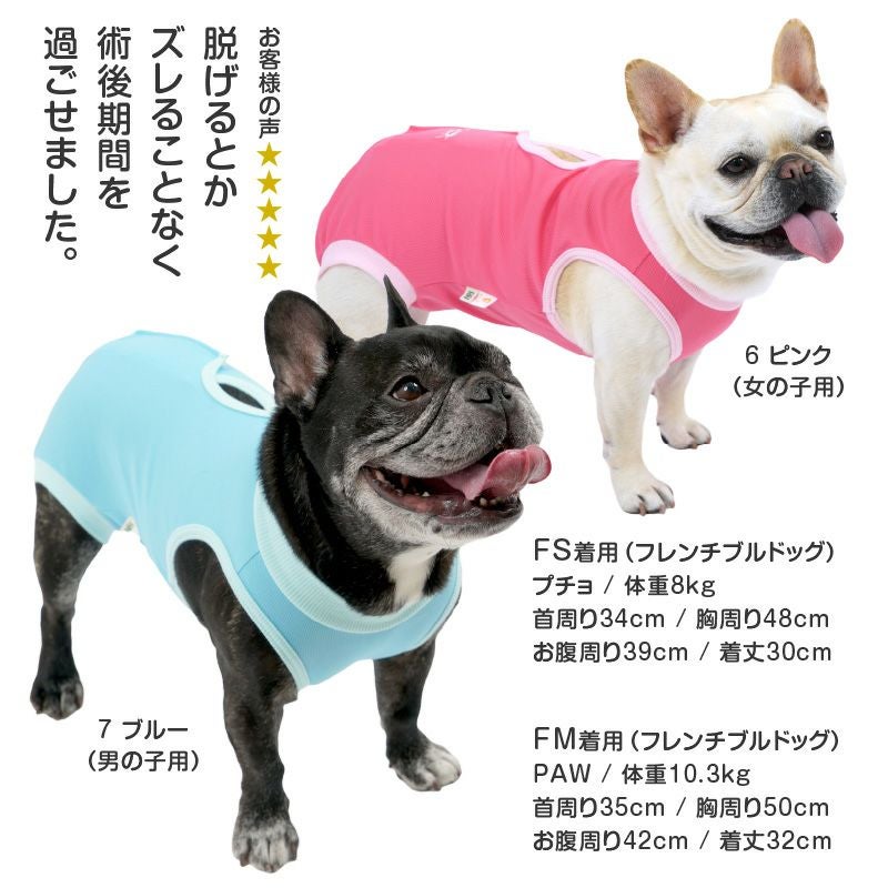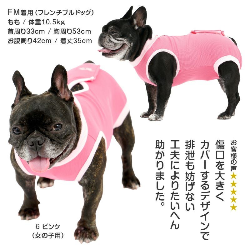 ver.2になって、よりお腹周りの傷口をカバーできる股ぐりに形状進化。男の子用同様に女の子用はパンツ丈が長くなり、さらに舐めにくい形になりました。術後服は脱いでしまうと意味が無いので、脱げにくくする為に着脱は少ししにくくなります。
