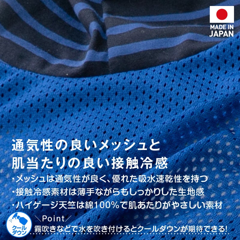 ひんやり接触冷感ボーダーと通気性抜群のメッシュの夏向け袖なしつなぎ。大きな星のワンポイントが入った爽やかボーダーカラーが目を惹く「清涼スタイル」。
