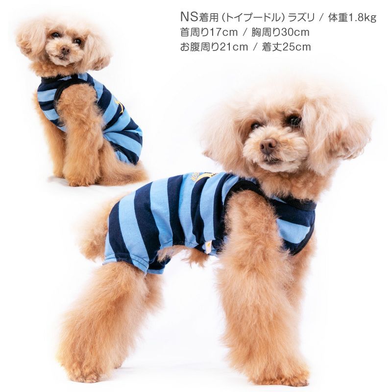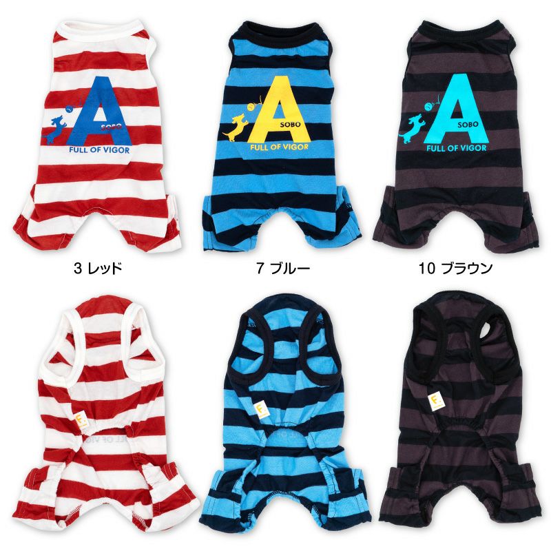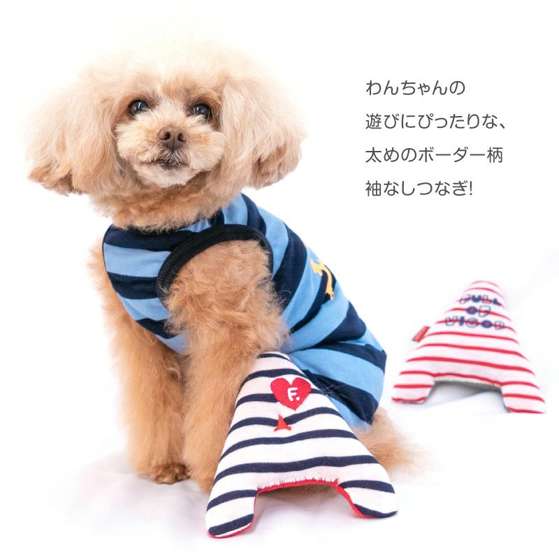 わんちゃんの遊びにぴったりな、太めのボーダー柄袖なしつなぎ!春夏のお出かけに公園や、山、海辺でも映える、可愛いカラーバリエーションが魅力です。