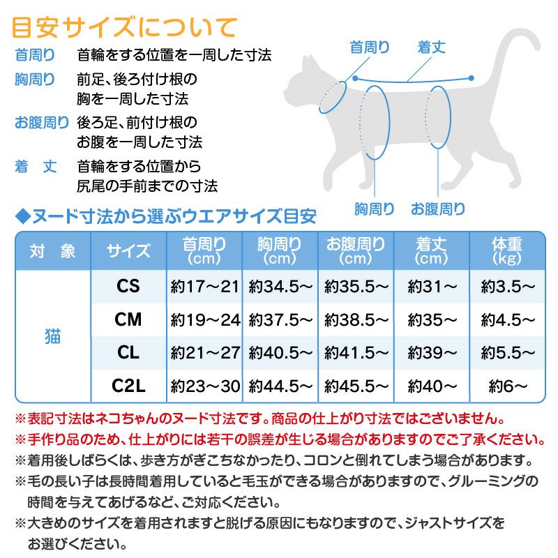 ☆3/10 CS届きましたので追記です。  猫2(雑種)、猫3(洋猫ミックス)共にCSで胸周りピッタリ、首元少し余裕で着用出来ました。ありがとうございました。皆様のサイズ選びの基準になれば幸いです。リピ予定です。 ───── ☆初回購入時レビュー 首周りをよく引っ掻く子のために買いました。お揃いで兄弟猫と同居猫にも買ったので三匹分着用レビュー書かせていただきます。計測数値はあくまでも目安です。 ・猫1♂兄雑種/首周り20/胸周り35/着丈36/体重5前後  →CSで肩周り胸周りがフィット。ゆったり着れています。 ・猫2♂弟雑種/首周り17〜18/胸周り32/着丈33/体重4.5程度  →首周り、胸周り共にかなり緩め。普段着用している皮膚保護ウェアや猫用袖なしつなぎはCMでちょうどいいのですが、トップスのみのネックウェアだと上半身の華奢さの方がサイズにダイレクトに響くようです。素材的には引っ掻きに強いので助かっています。 ・猫3♀洋猫MIX/首周り19/胸周り33/着丈36/体重5前後  →兄猫より半周り大きい洋猫ミックス♀(こちらも普段CM着用)にCMを着せてみると、やはり上半身が華奢なのか首周り胸周りがかなり緩めでした。 上記の兄弟二匹は同腹同時生まれ色違いですが、サイズを測った上で同じCMを着せると骨格の差が大きく影響しました。