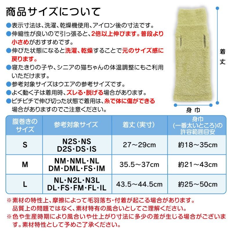 Mサイズで、4.6キロの細長い体型のトイプードルにぴったりでした。柔らかく伸びがよいです。見た目もとても可愛くて、買ってよかったです。日本製のおかげか、お値段の割に高級感があります。洋服タイプの腹巻きは3種類購入しましたが、これが一番保温性が高そうです。
